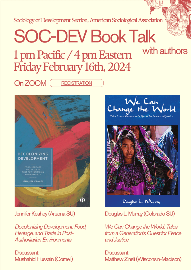 Jennifer Keahey and Douglas L. Murray will provide brief introductions to their recently published or soon-to-be-published books, Decolonizing Development: Food, Heritage, and Trade in Post-Authoritarian Environments and We Can Change the World: Tales from a Generation’s Quest for Peace and Justice. During their presentations, the authors will elucidate how their work contributes to ongoing discussions within the field of Sociology of Development.